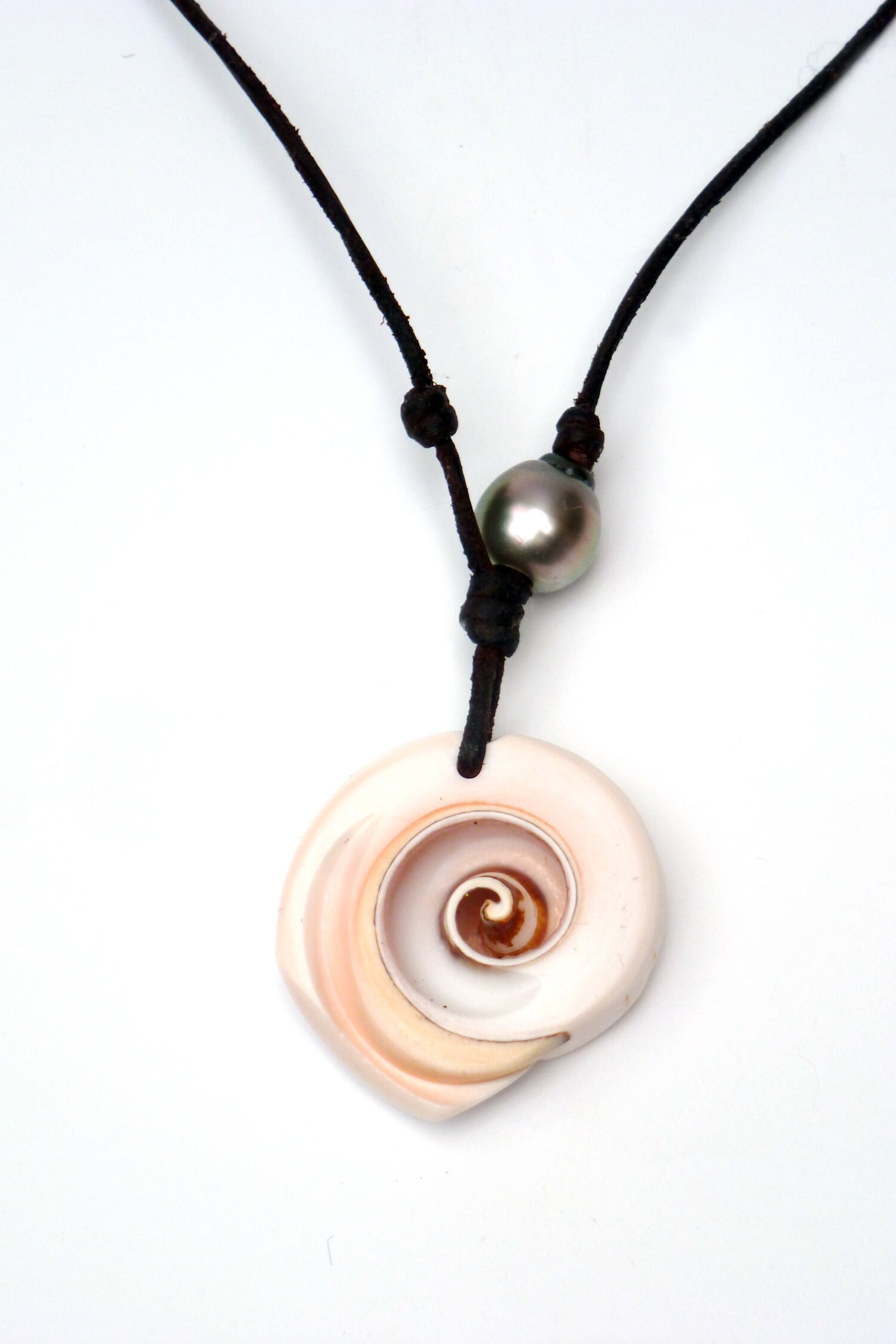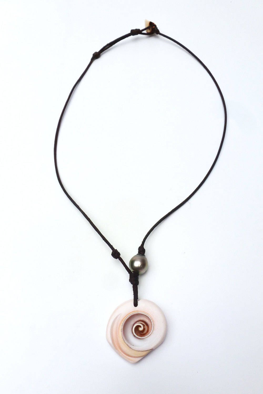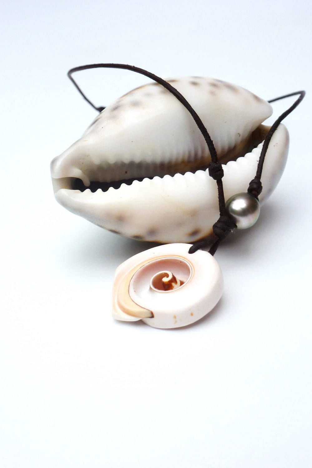 Tahitian pearl and conch shell necklace for woman on leather certified black pearl.