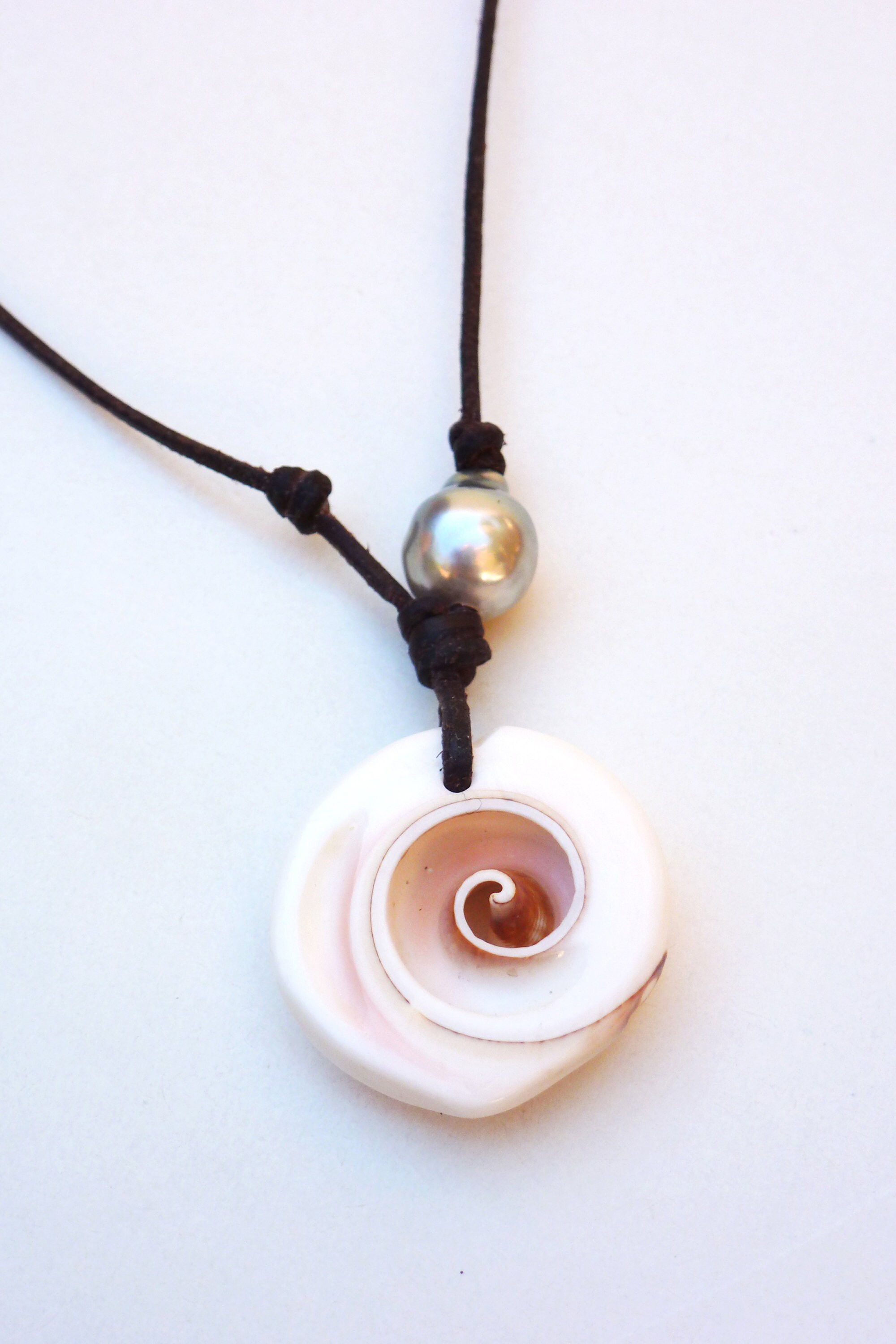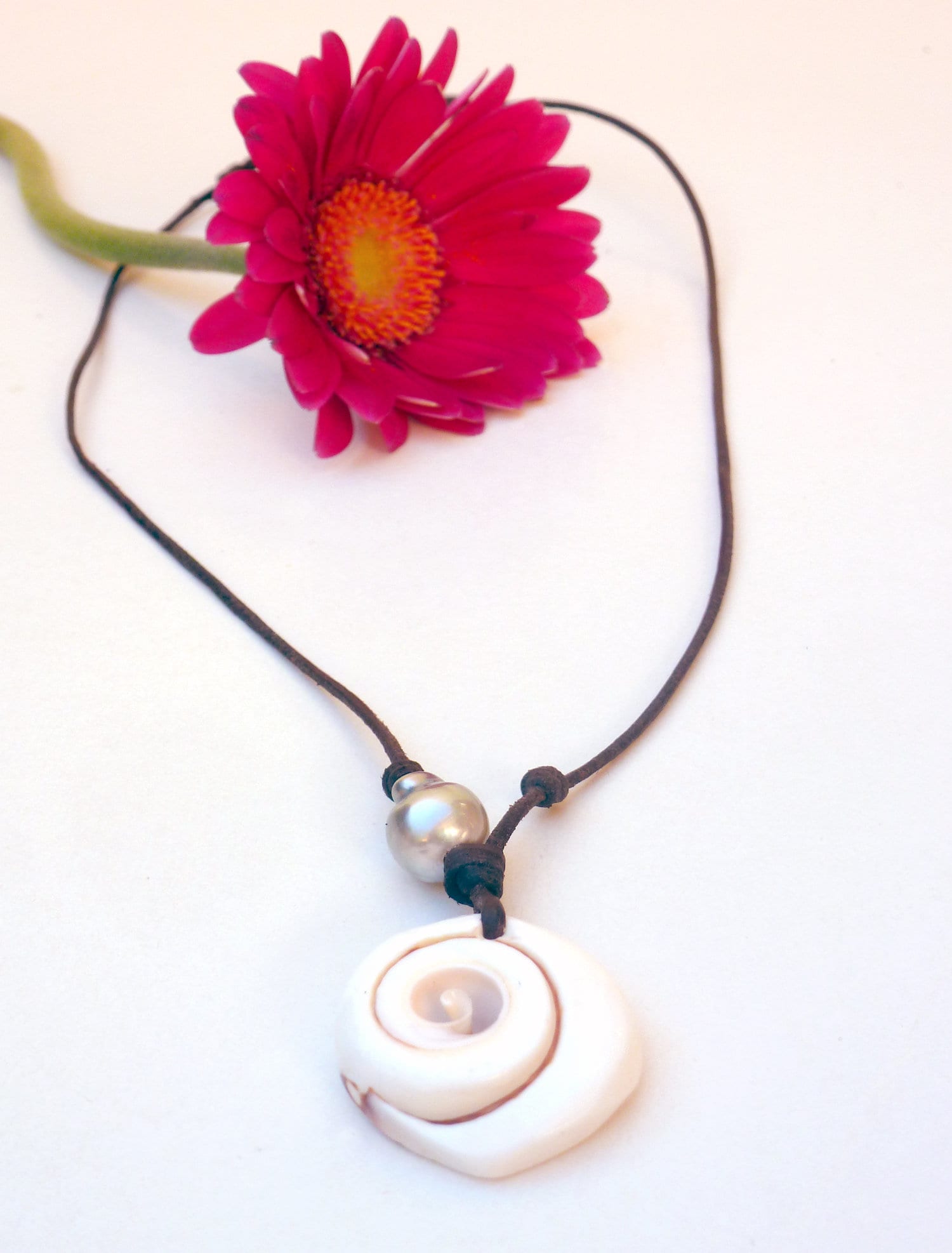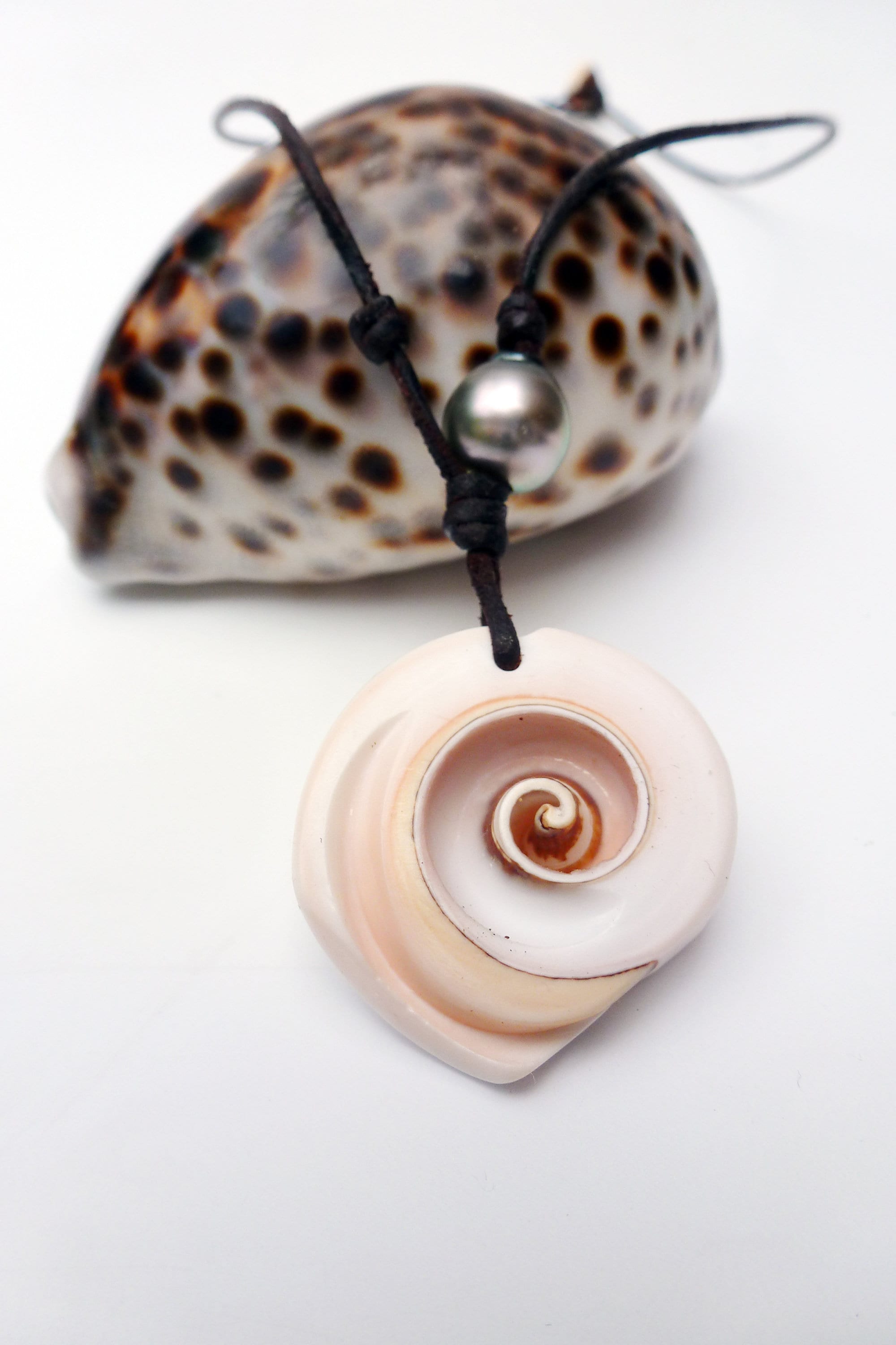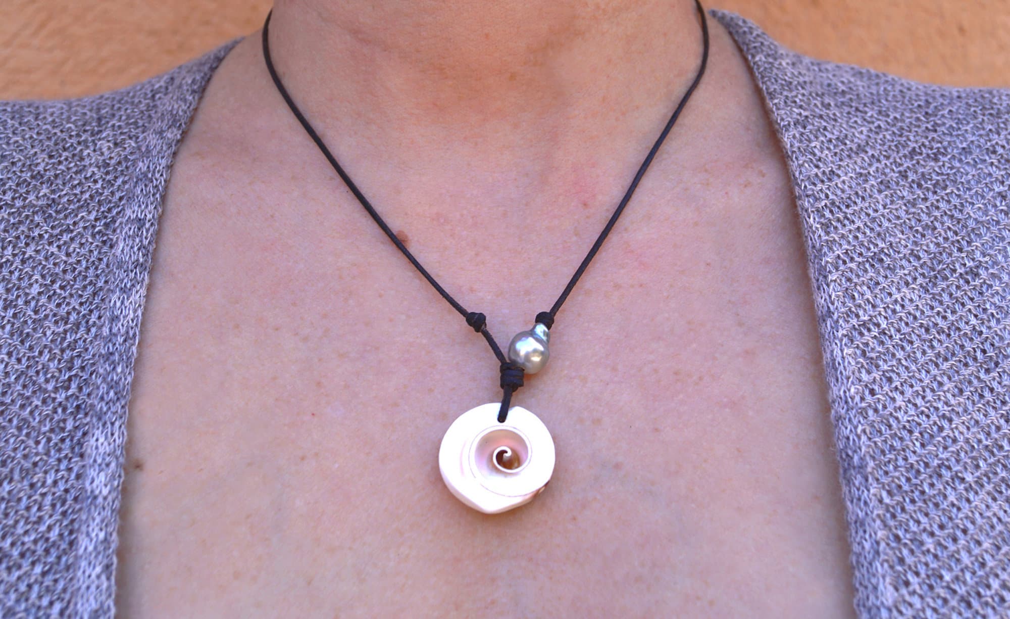 Tahitian pearl and conch shell necklace for woman on leather certified black pearl.