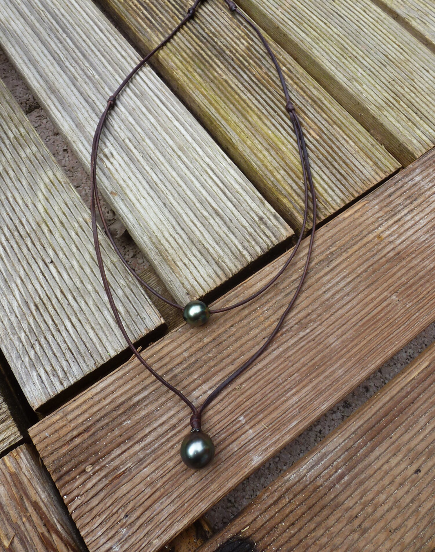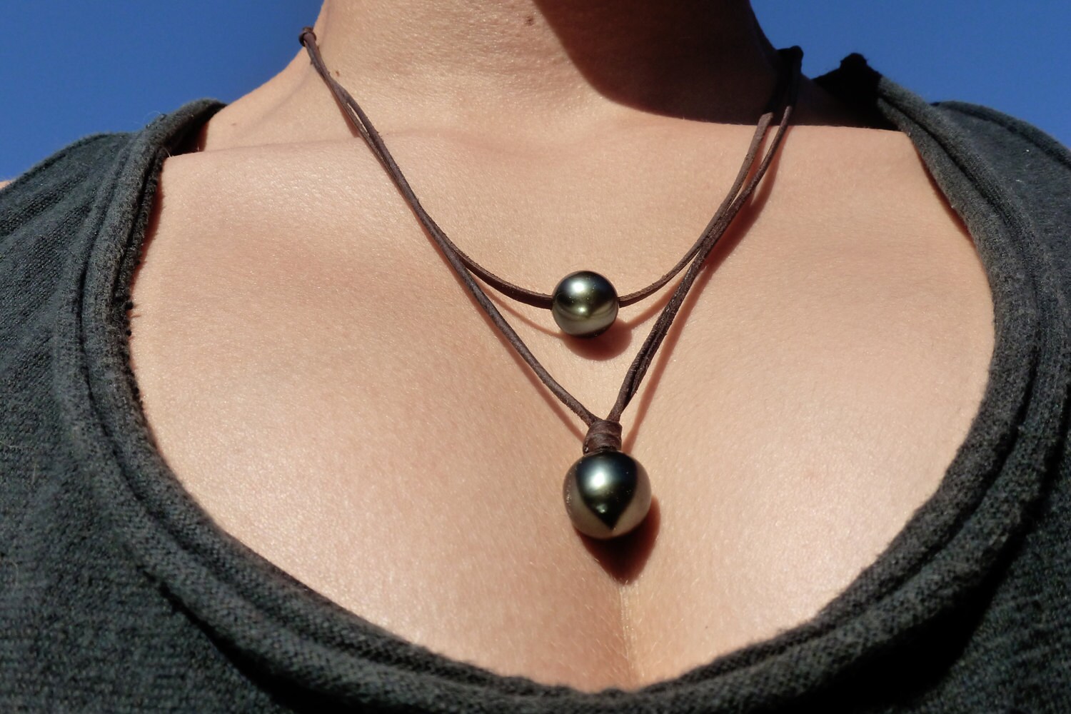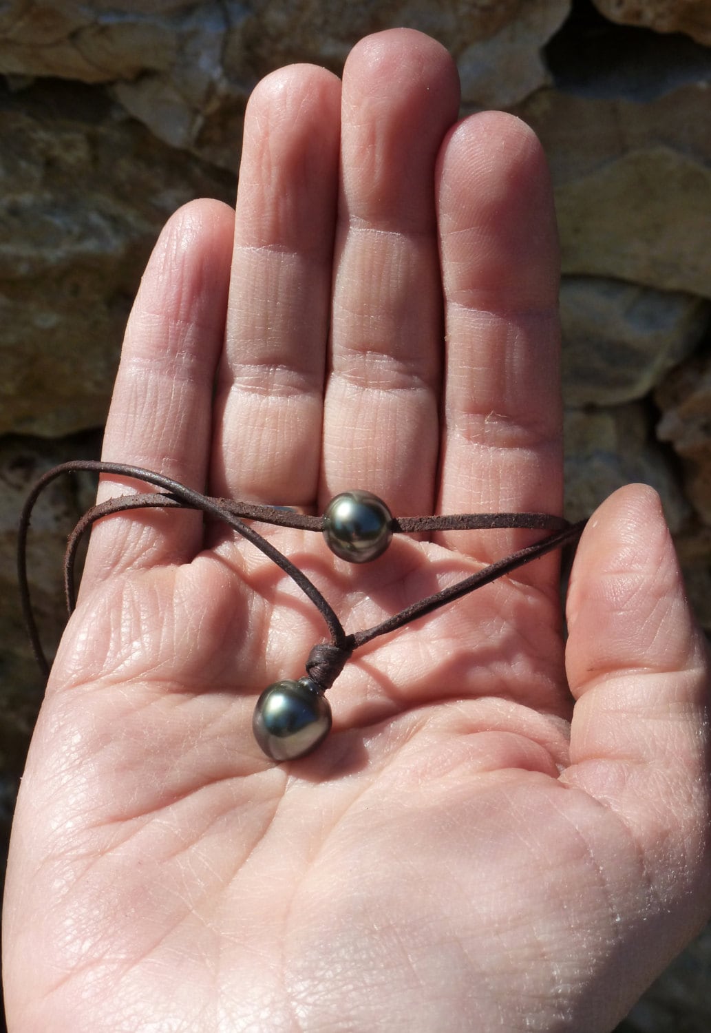 Beautiful tahitian pearls necklace for men or women with two black pearls on Australian leather, these pearls are certified and come directly from Tahiti, French Polynesia.