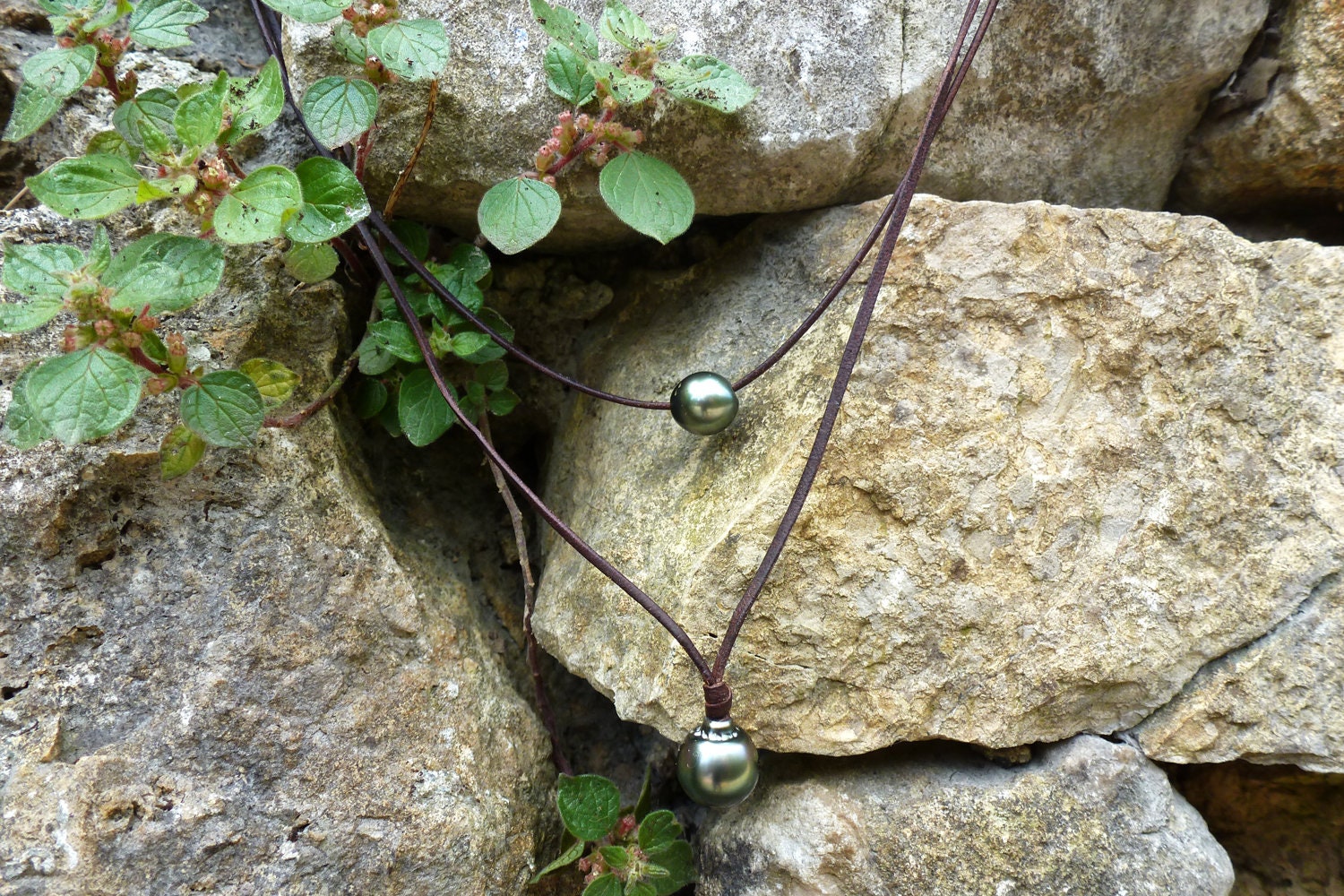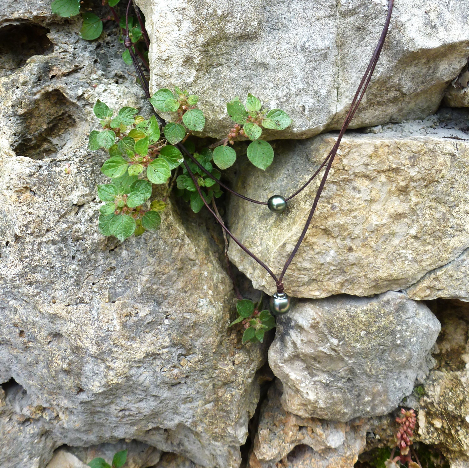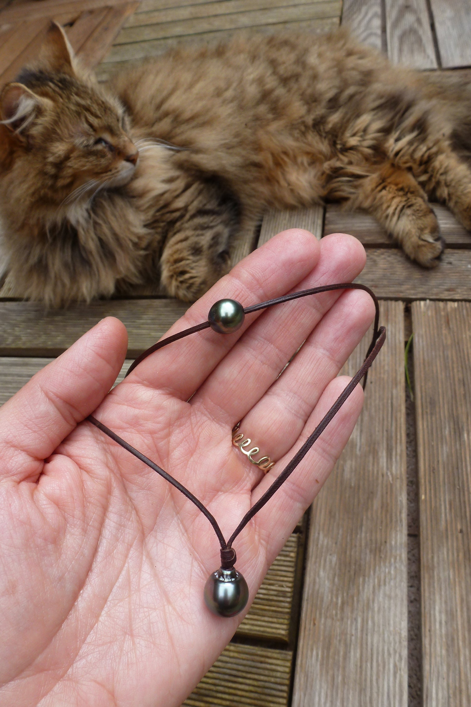 Beautiful tahitian pearls necklace for men or women with two black pearls on Australian leather, these pearls are certified and come directly from Tahiti, French Polynesia.