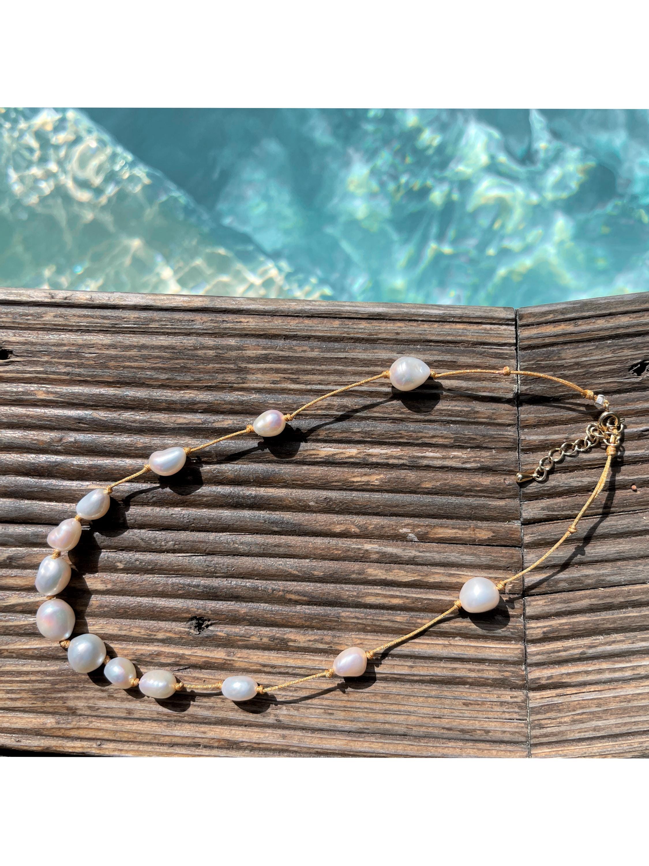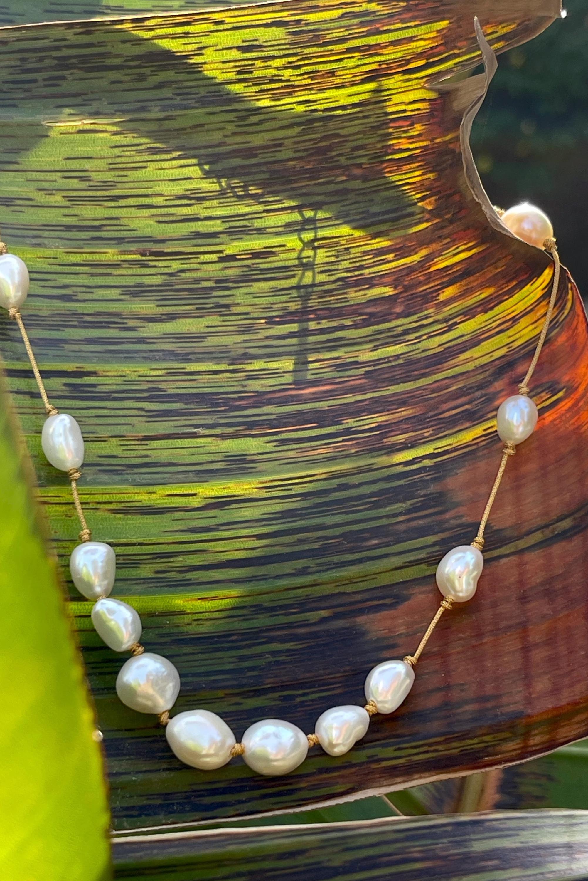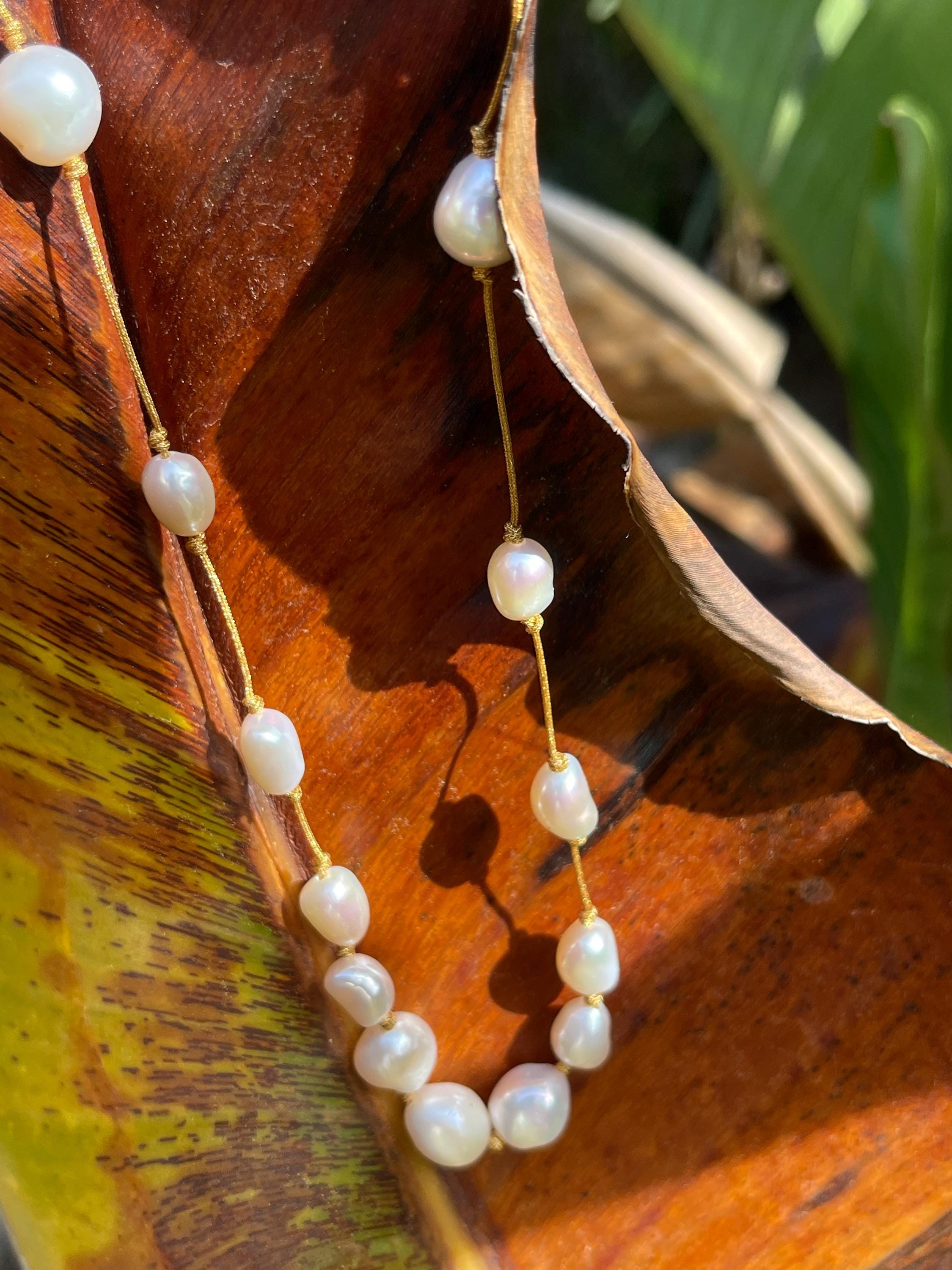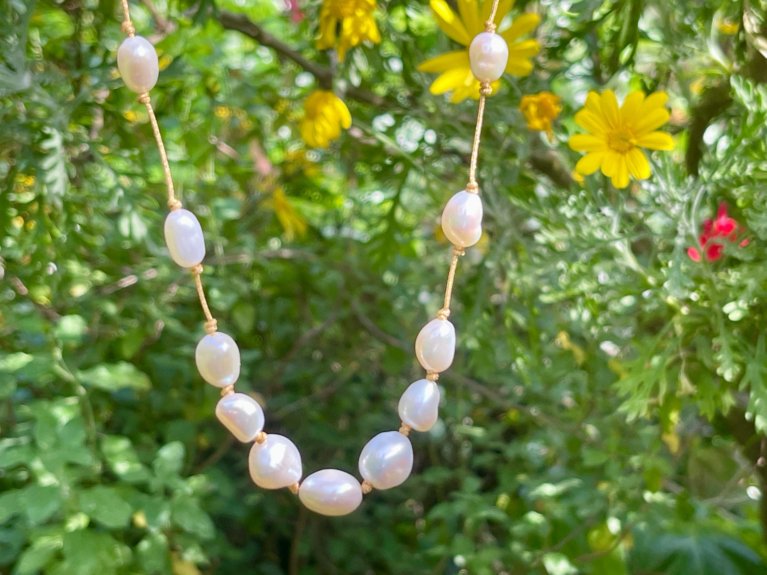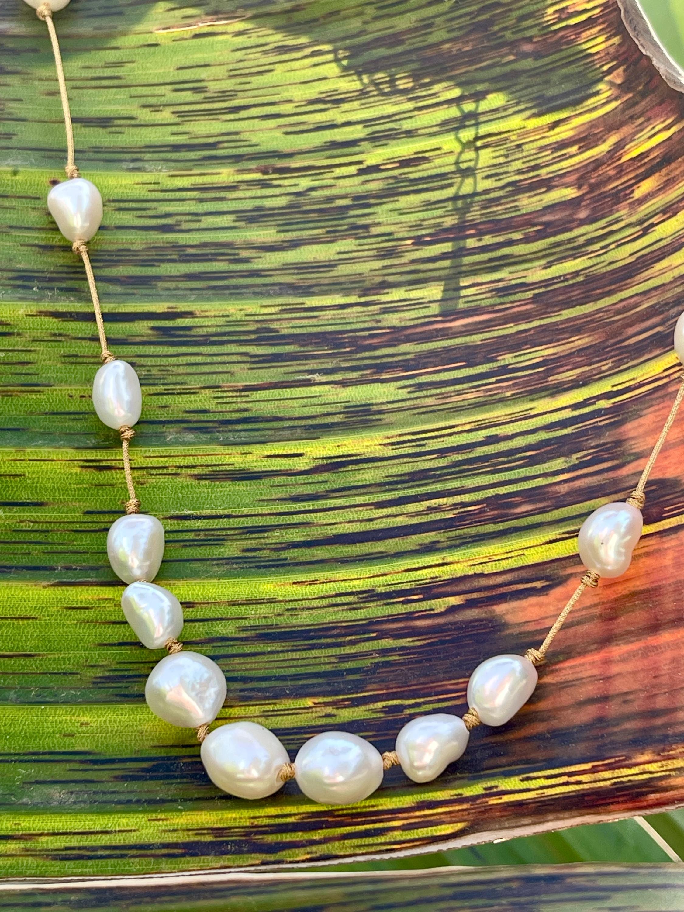 The cultured pearls are strung on a subtly shimmering gold silk thread, creating a luxurious and ethereal look.