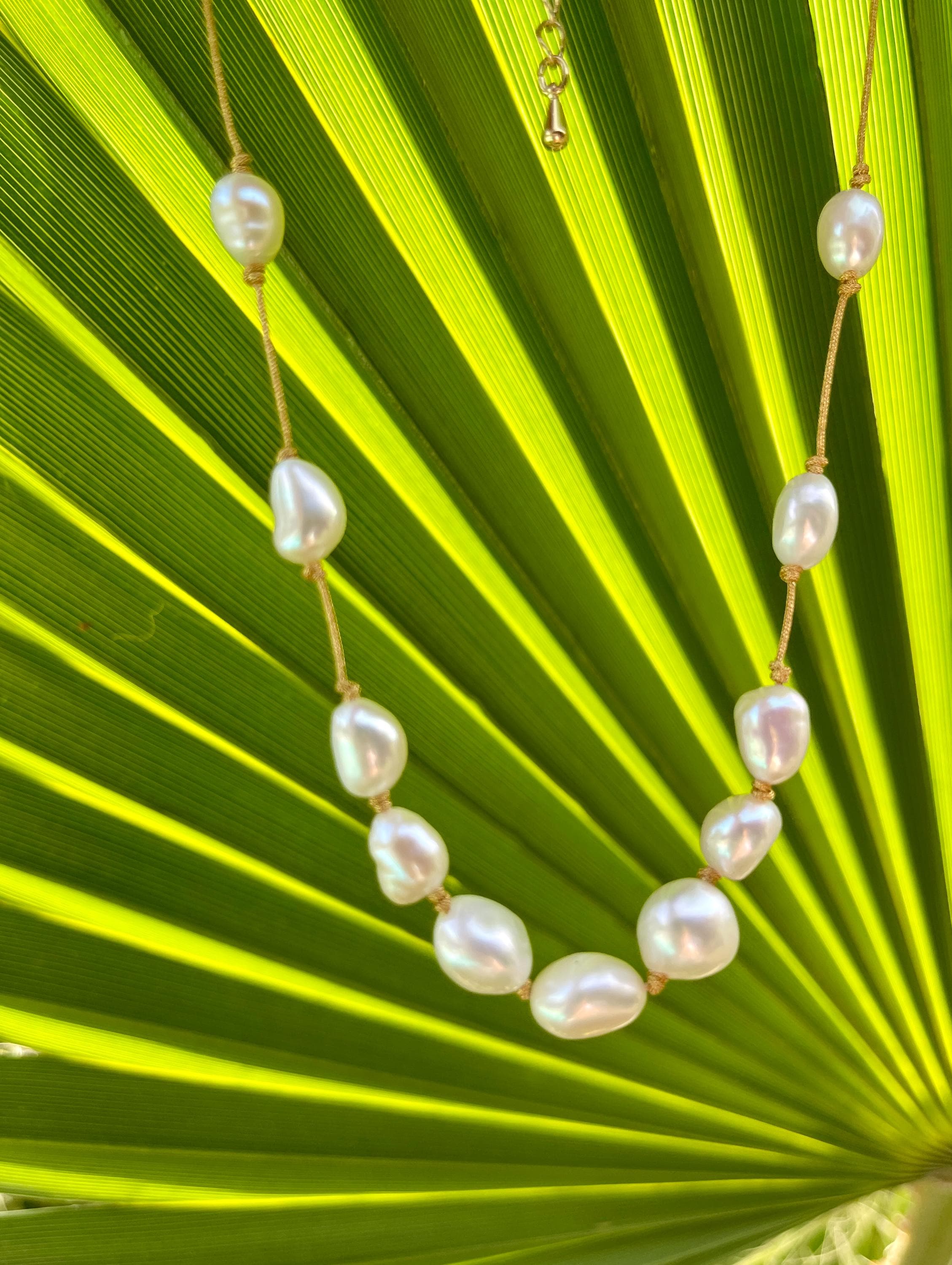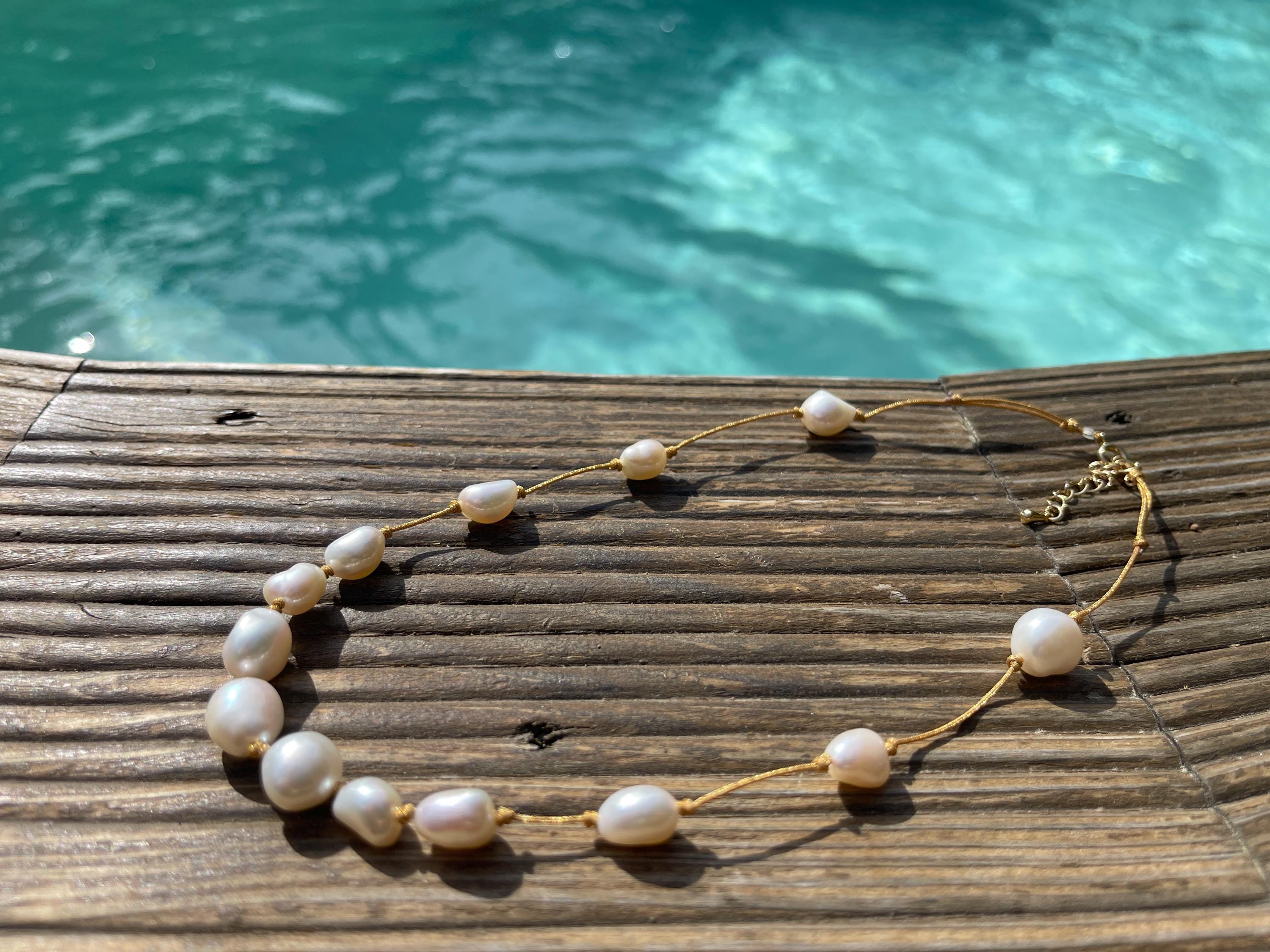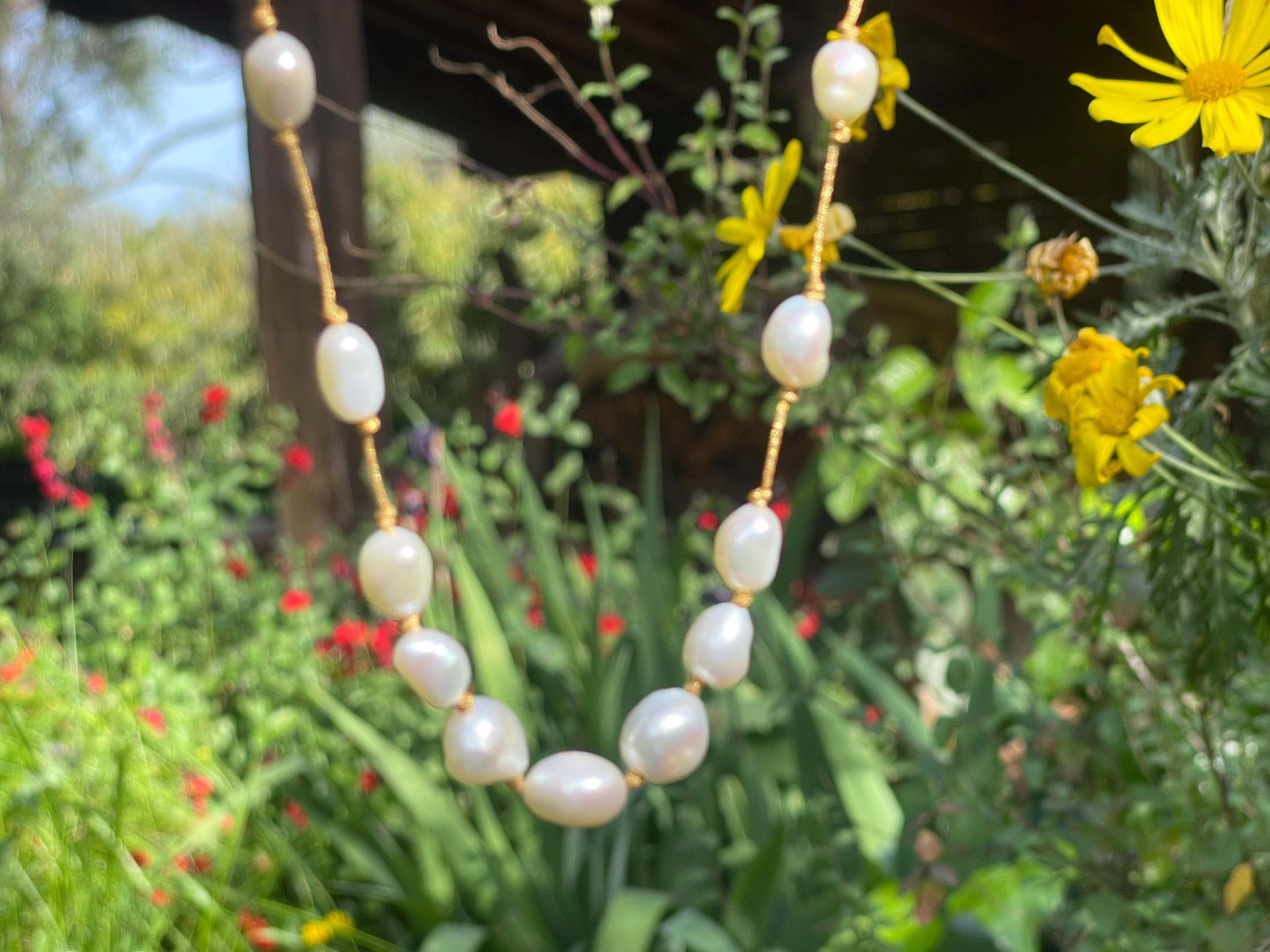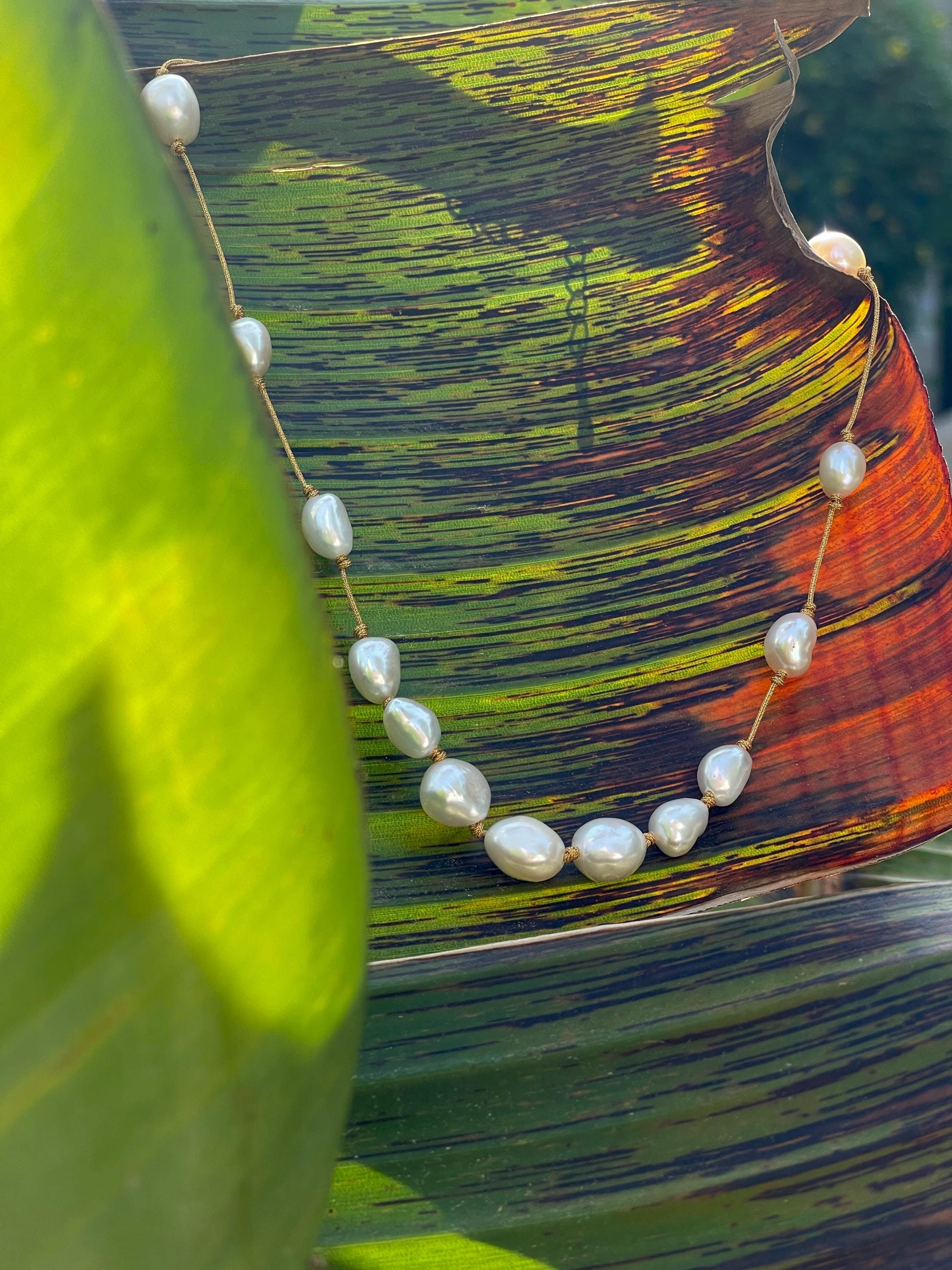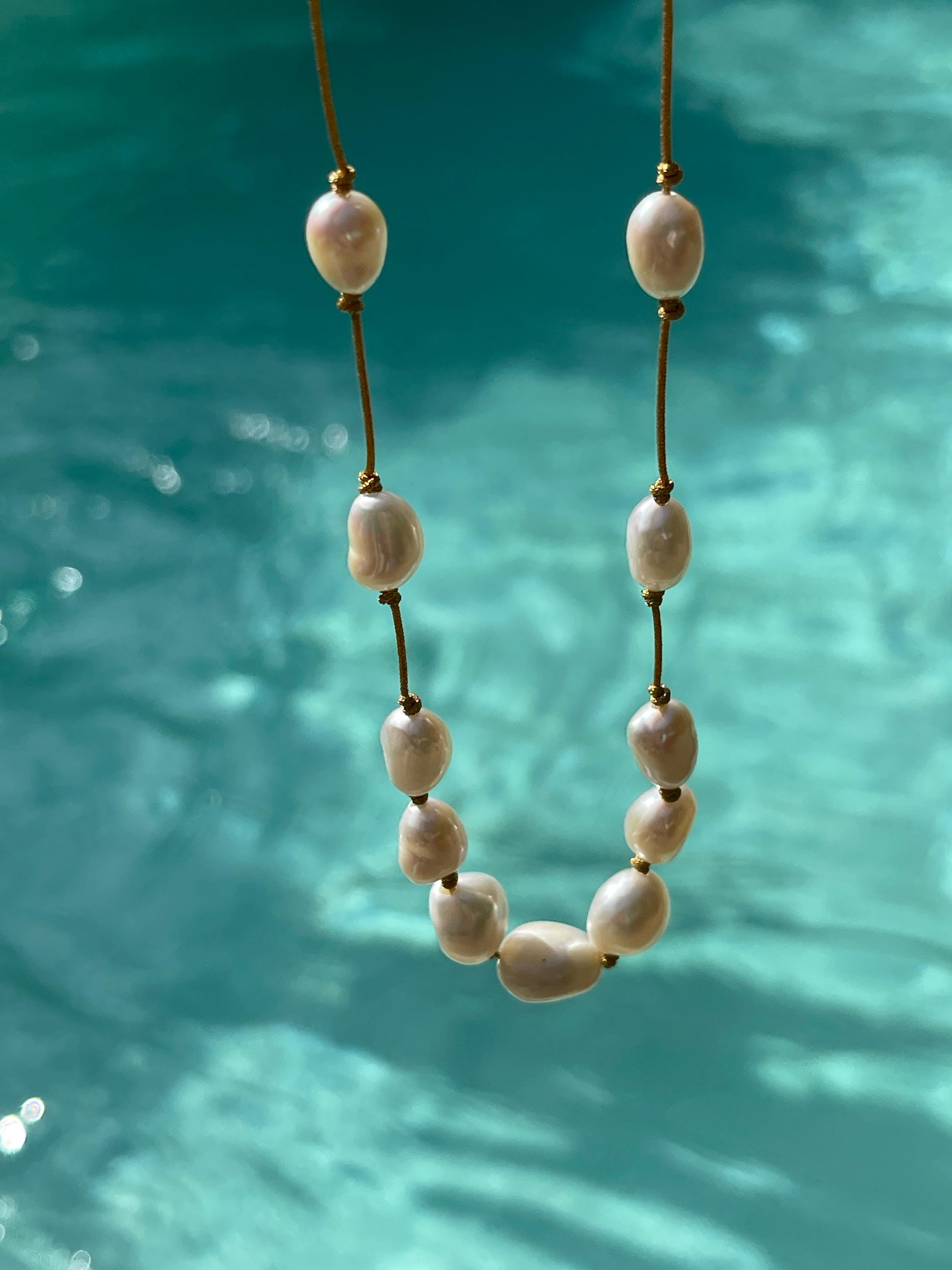 The cultured pearls are strung on a subtly shimmering gold silk thread, creating a luxurious and ethereal look.