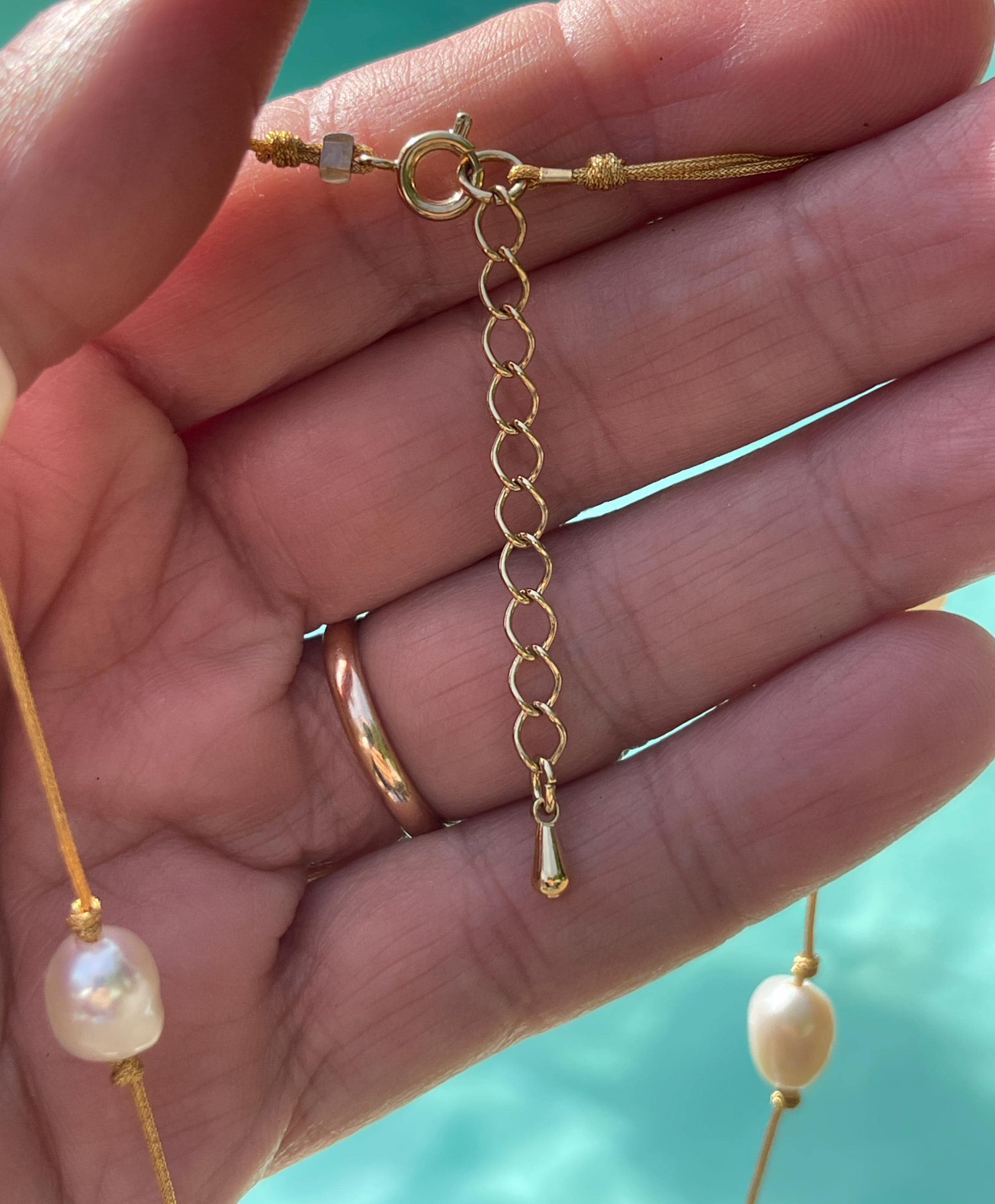 The clasp is gold-filled (thick 14k gold plating) with a 5 cm gold-filled extension chain, a spring ring, and a closed ring. Two flat gold-filled beads secure the necklace.