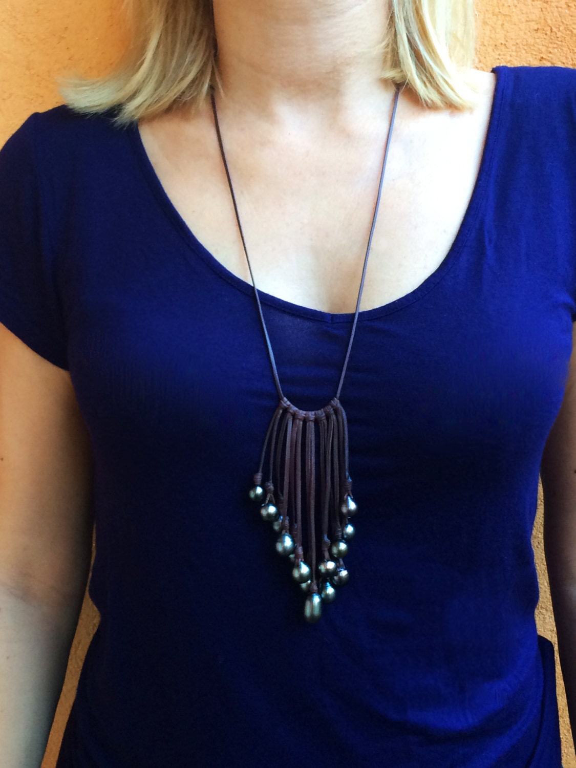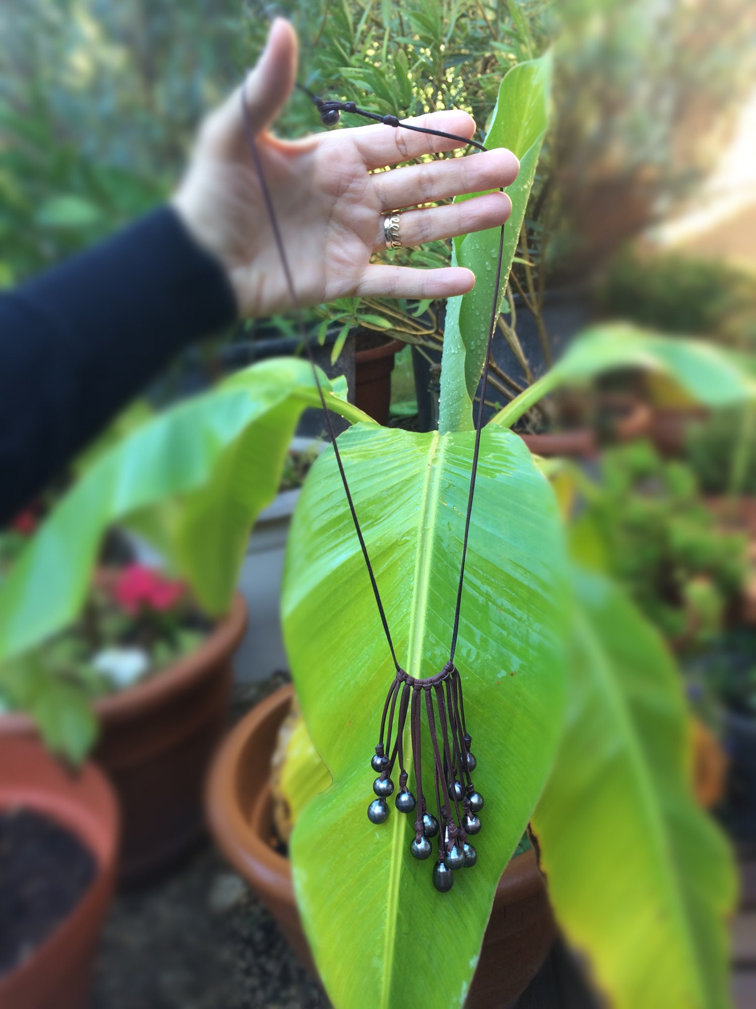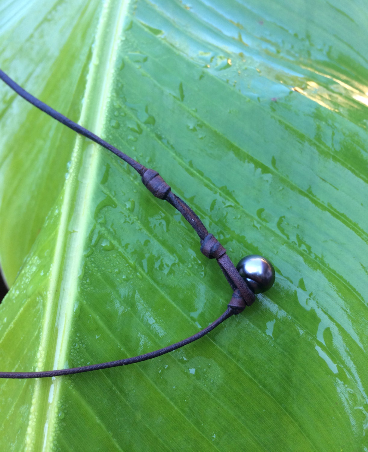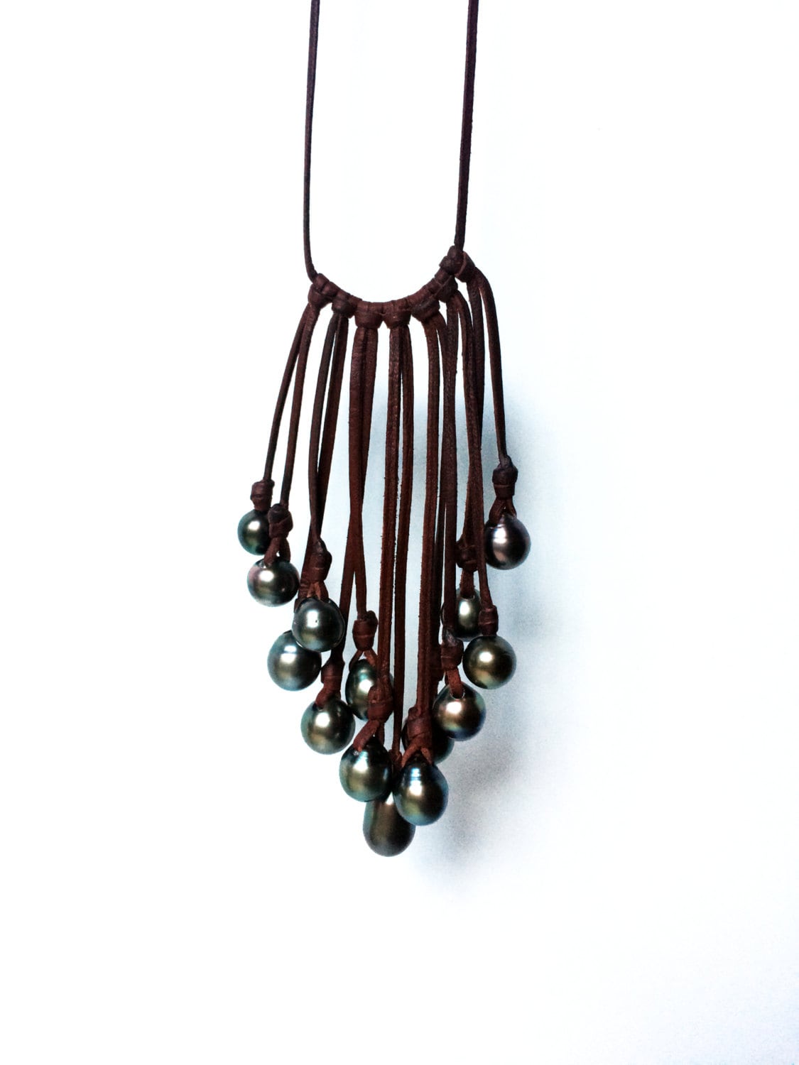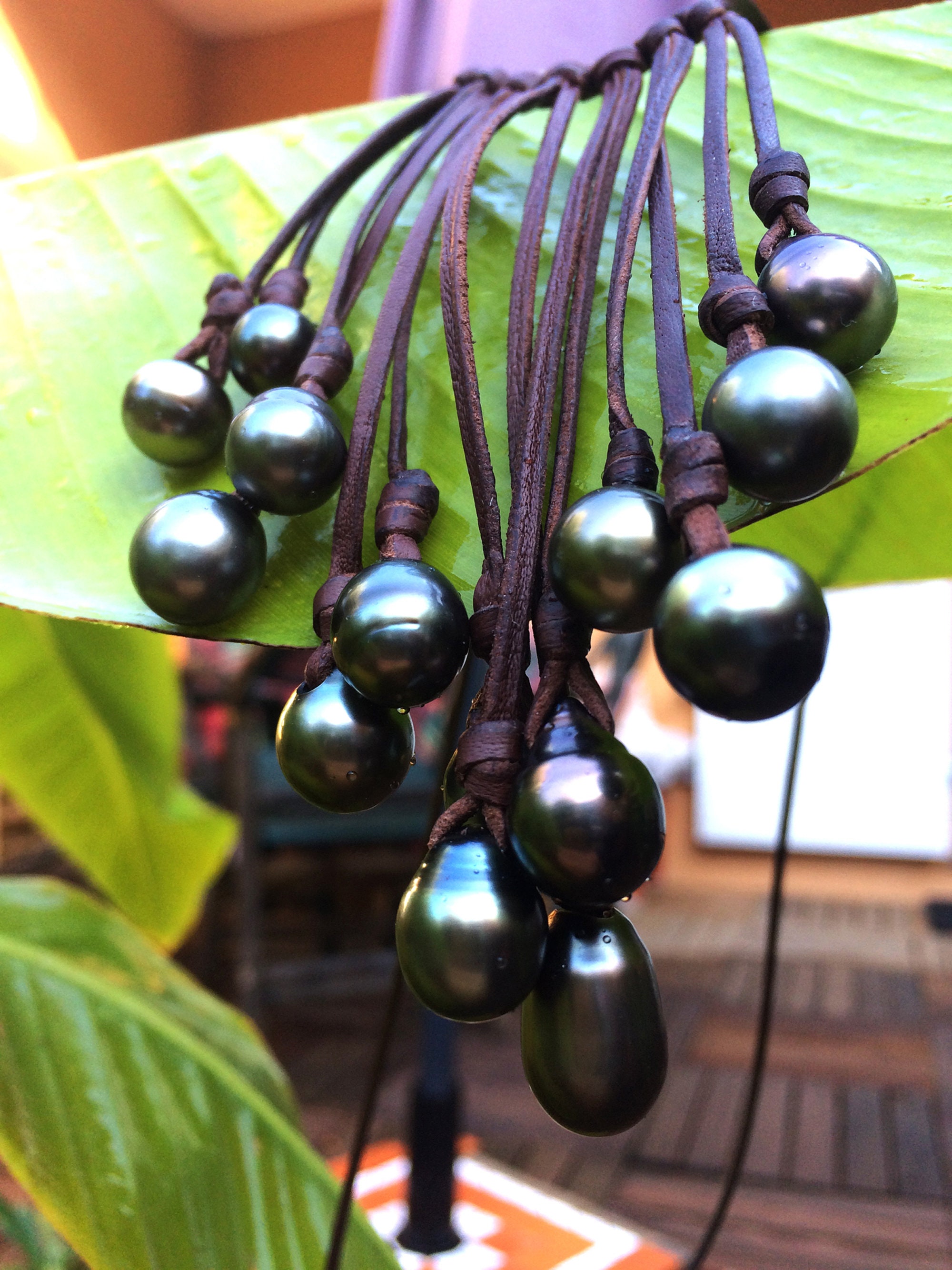 A beautiful cluster of Tahitian pearls mounted on an Australian leather necklace.